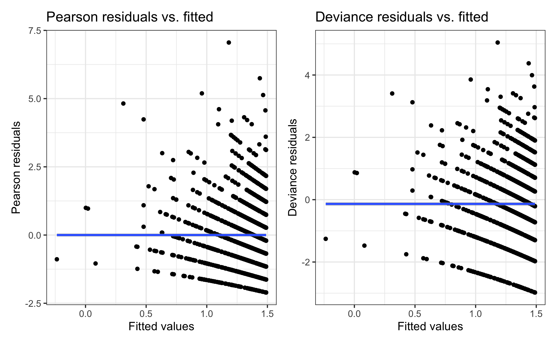 We can calculate two types of residuals for Poisson regression: Pearson residuals and deviance residuals