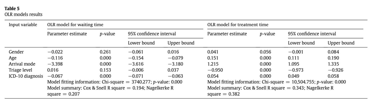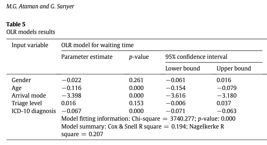 Ataman and Sarıyer (2021) use ordinal logistic regression to predict patient wait and treatment times in an emergency department (ED). The goal is to identify relevant factors that can be used to inform recommendations for reducing wait and treatment times, thus improving the quality of care in the ED.